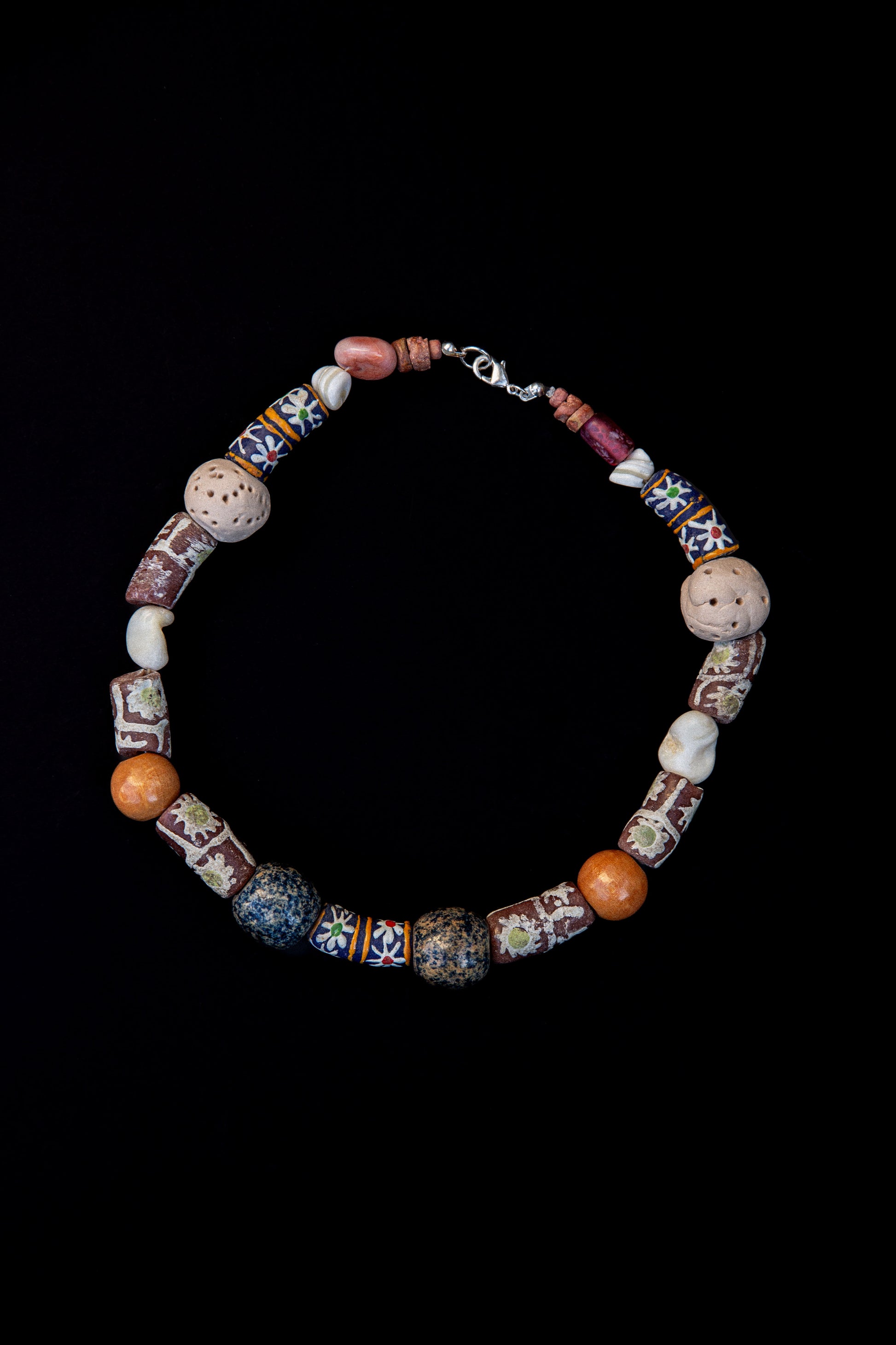 Gargantilha com mix de coral africano, terracota, barro, madeira e concha. Fecho em prata de lei, acompanha extensor dourado com banho duplo de ouro 18k. Extensão total da peça: 48cm.