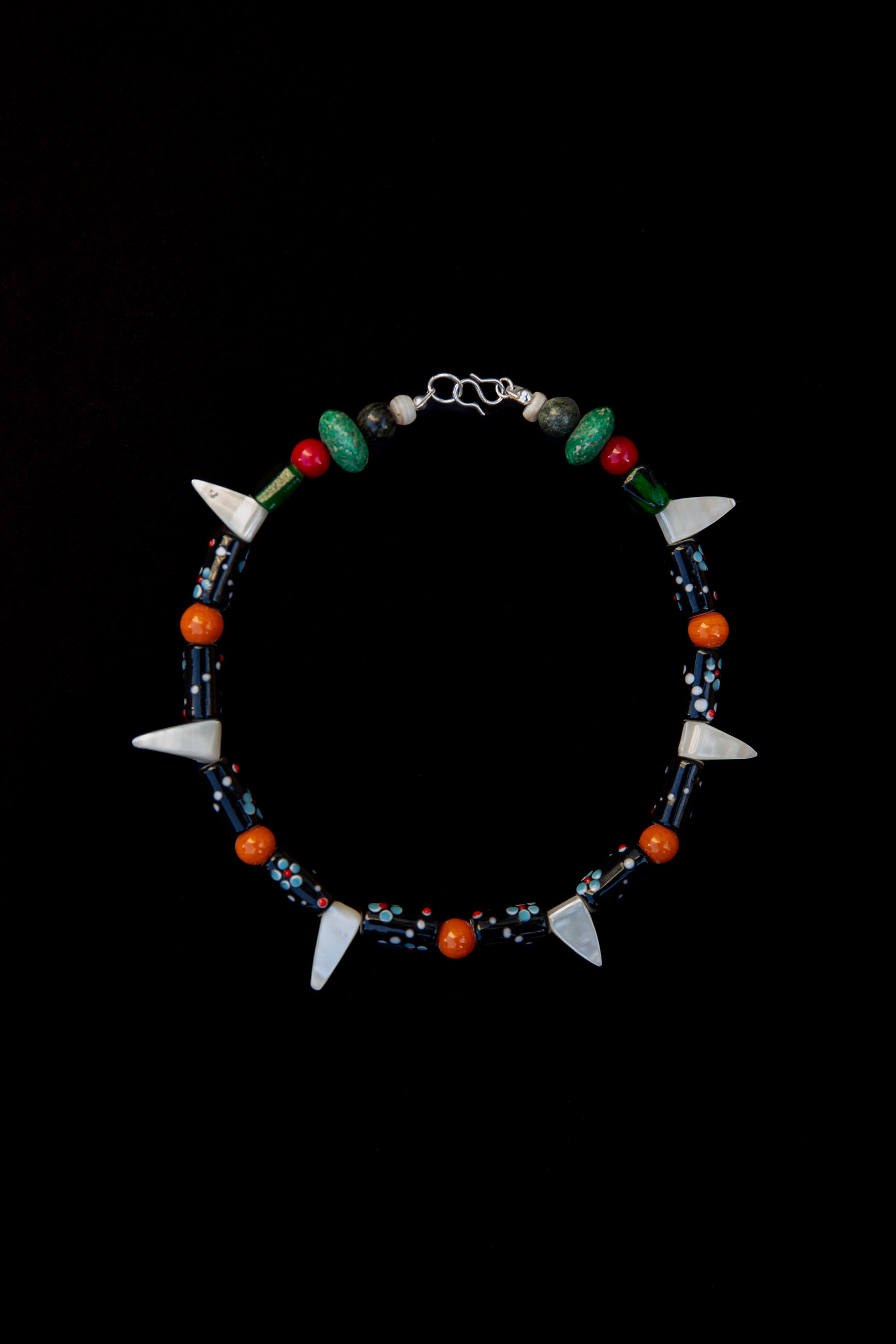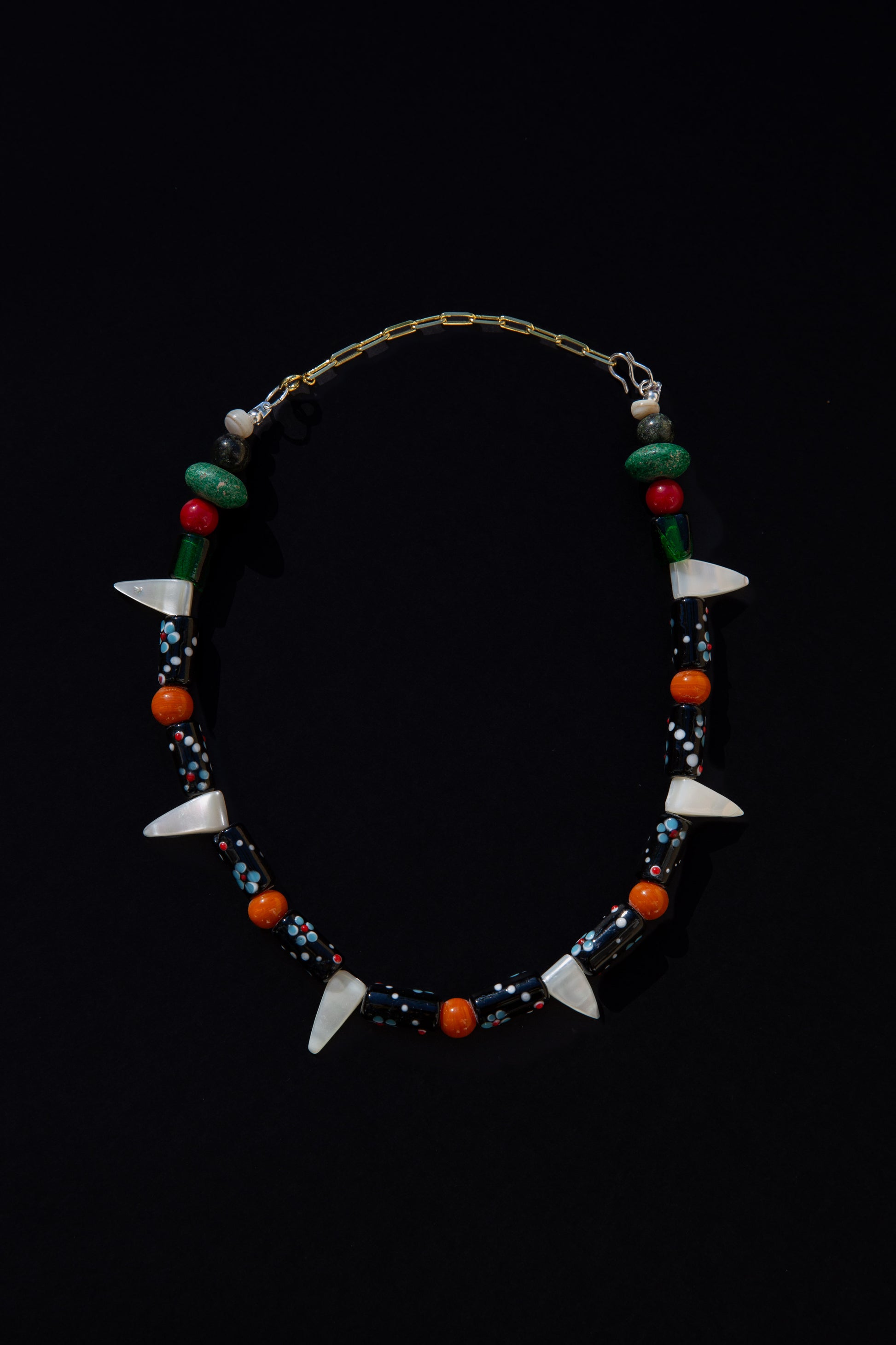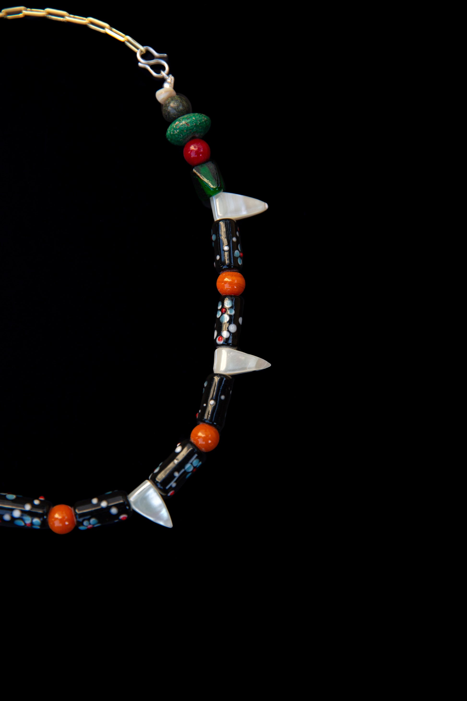 Gargantilha com mix de pedra natural, madeira pintada à mão, madre-pérola e resina. Fecho em prata de lei, acompanha extensor dourado com banho duplo de ouro 18k. Extensão total da peça: 43cm.