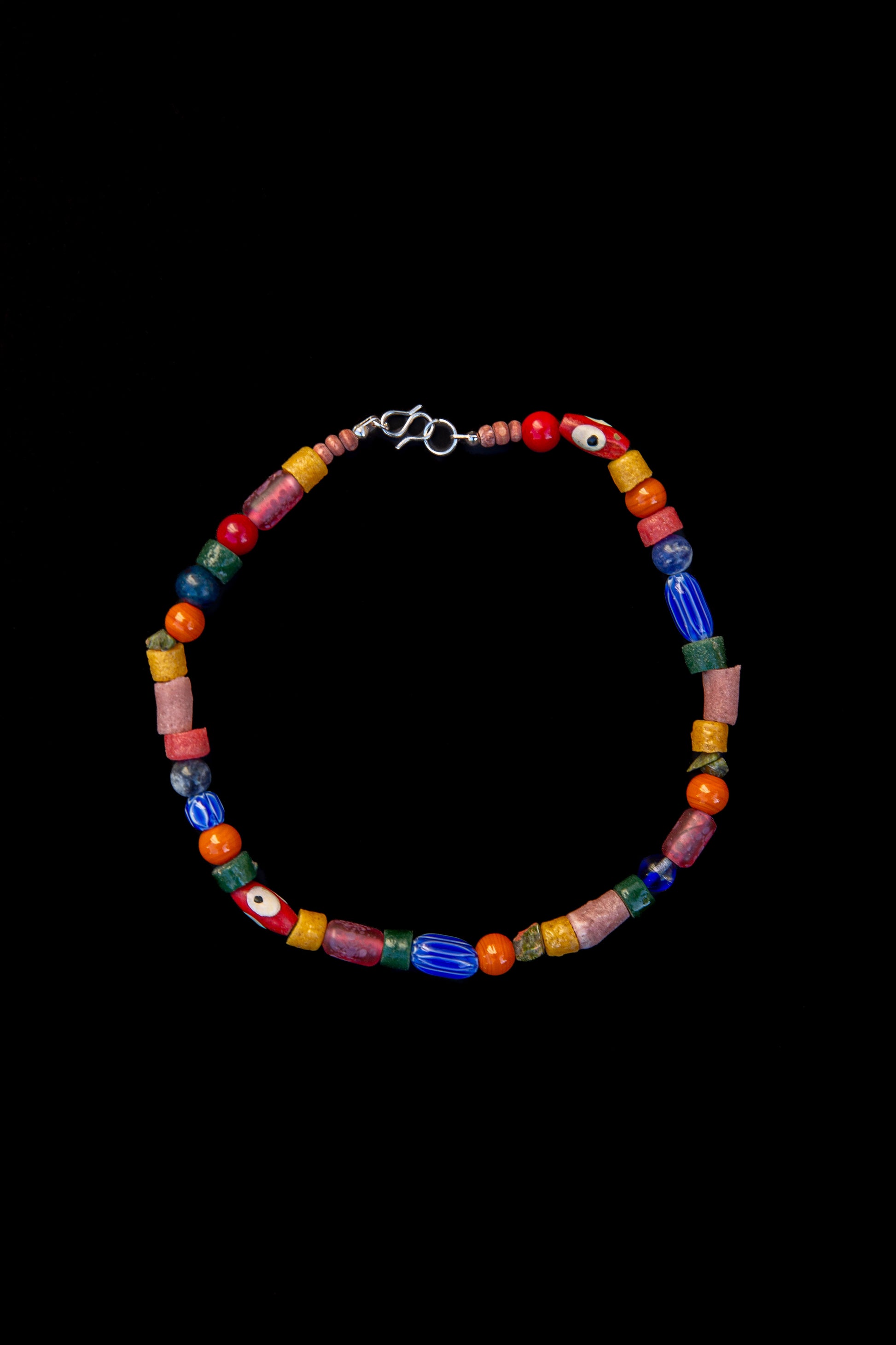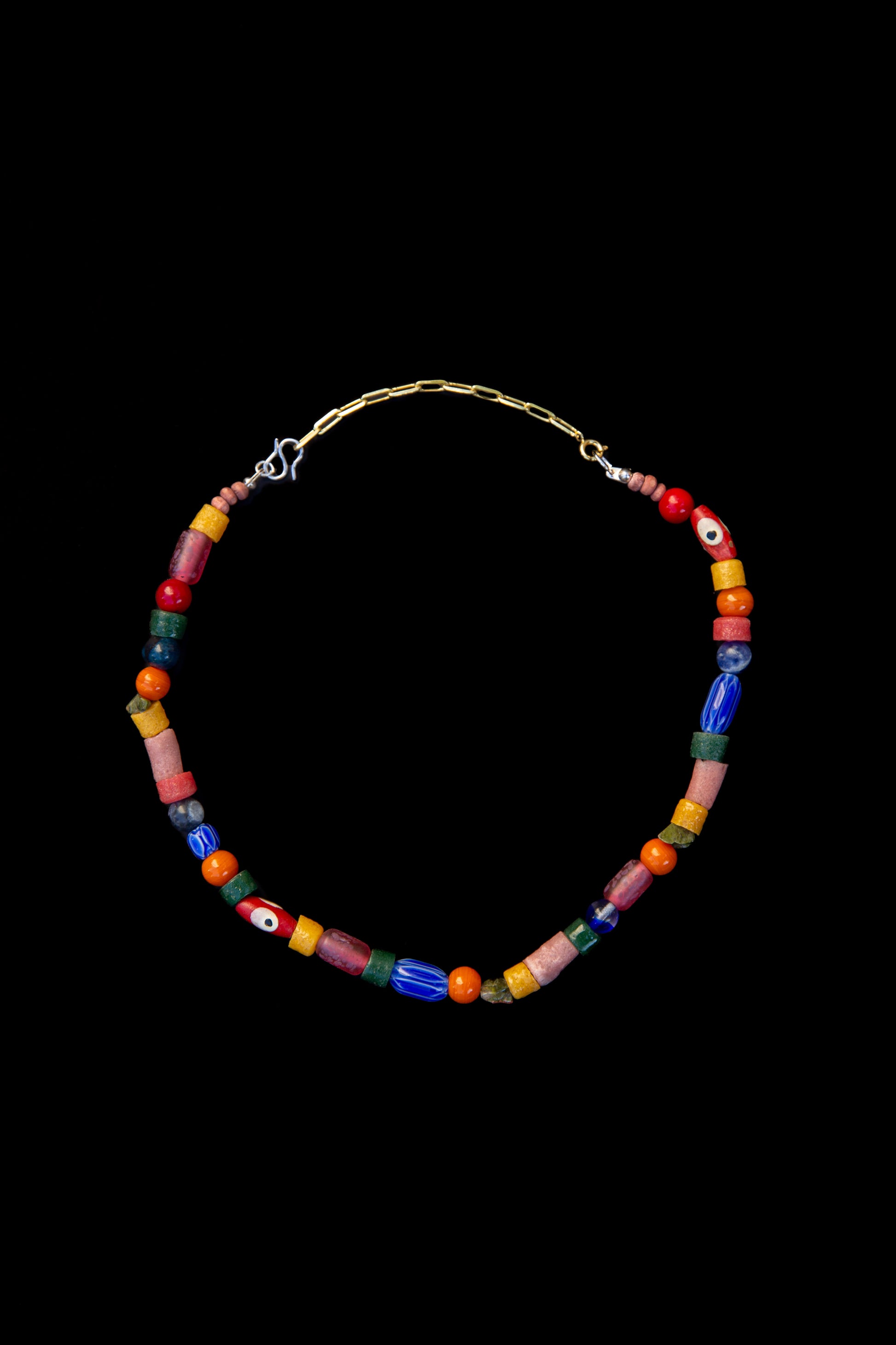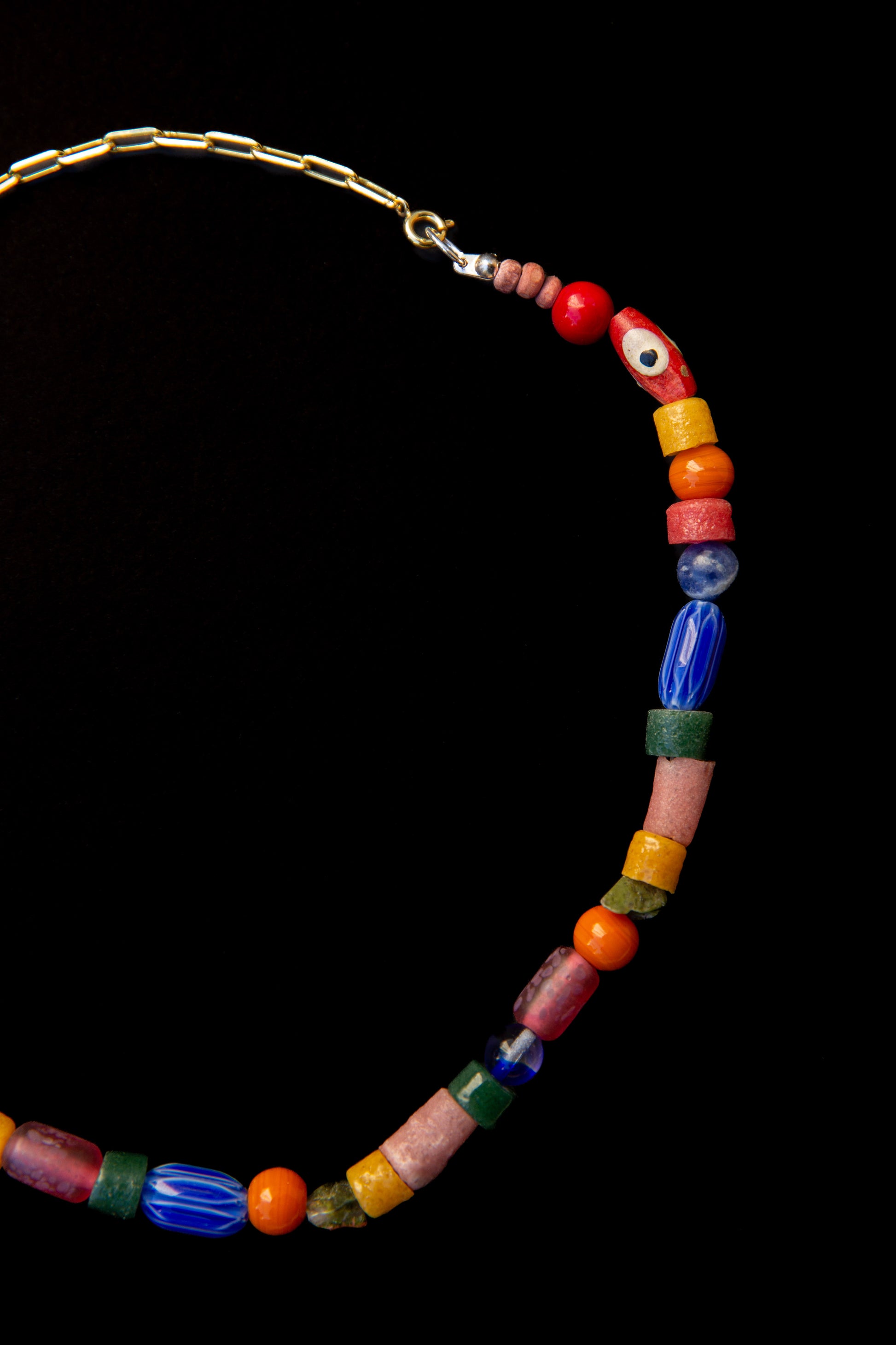 Gargantilha com mix de coral africano, madeira pintada à mão, pedra natural, resina e semente de açaí. Fecho em prata de lei, acompanha extensor dourado com banho duplo de ouro 18k. Extensão total da peça: 44cm.