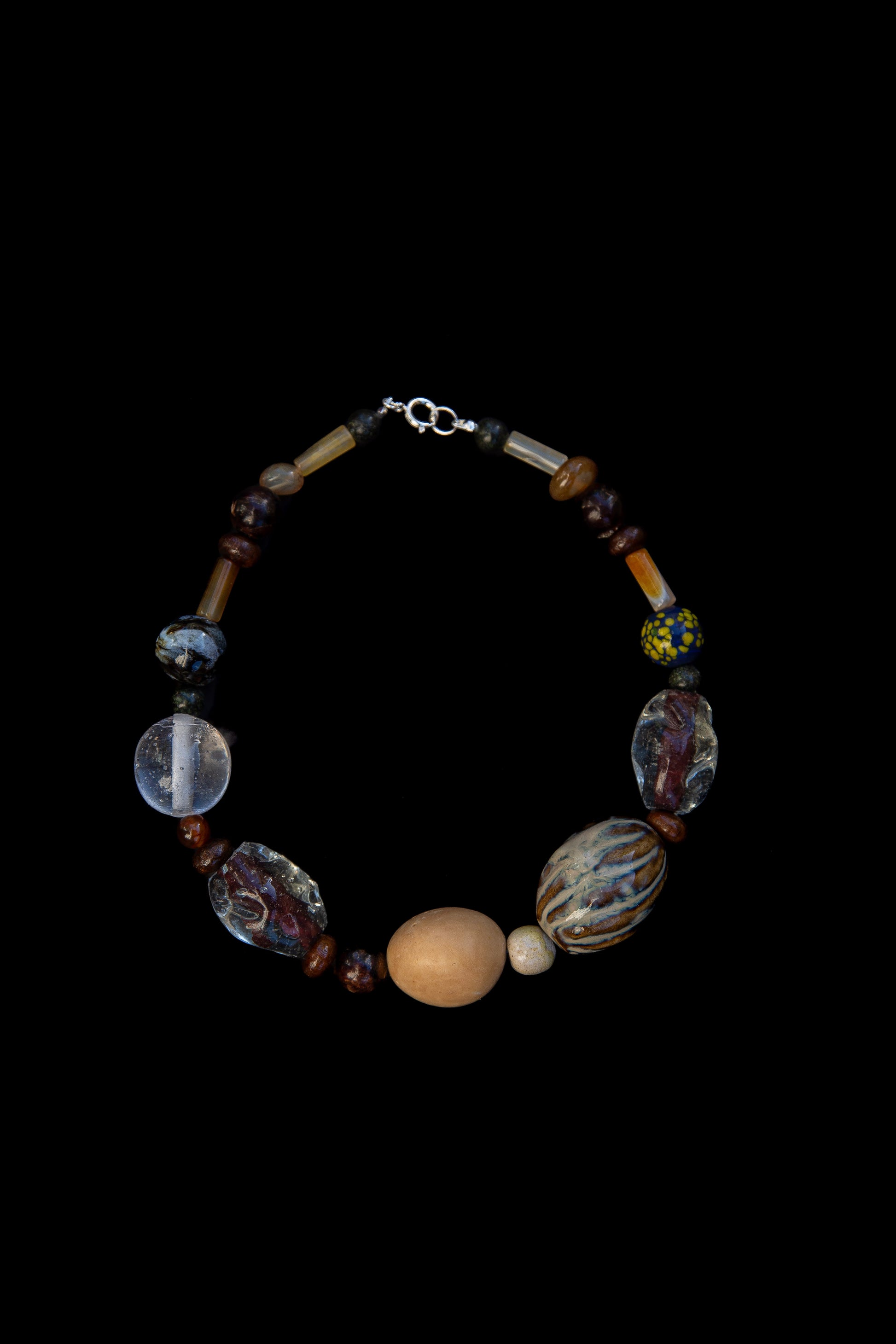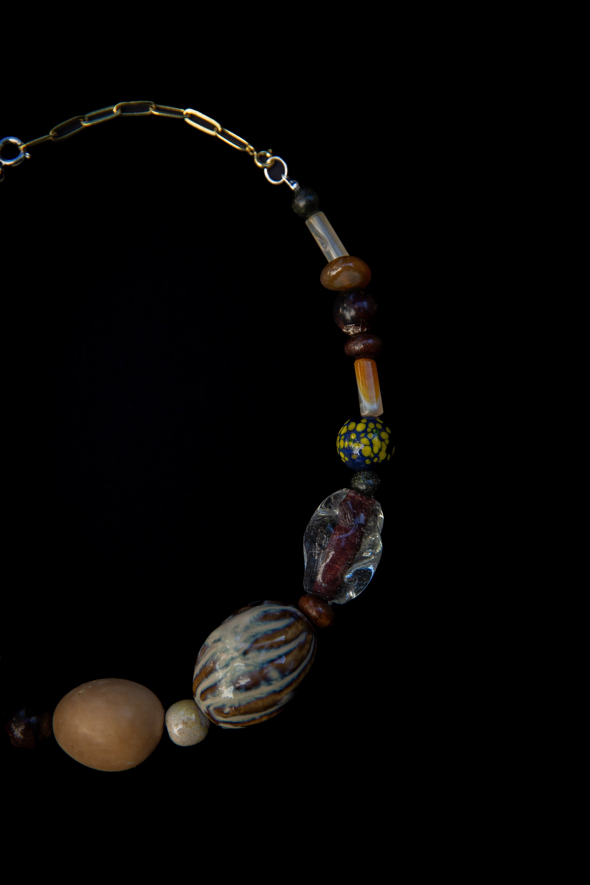 Gargantilha com mix de sementes, cerâmica, vidro, madeira, resina e pedra natural. Fecho em prata de lei, acompanha extensor dourado com banho duplo de ouro 18k. Extensão total da peça: 48cm.