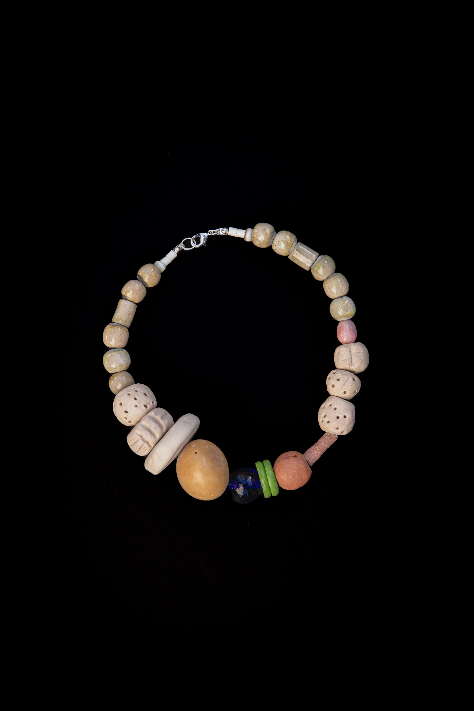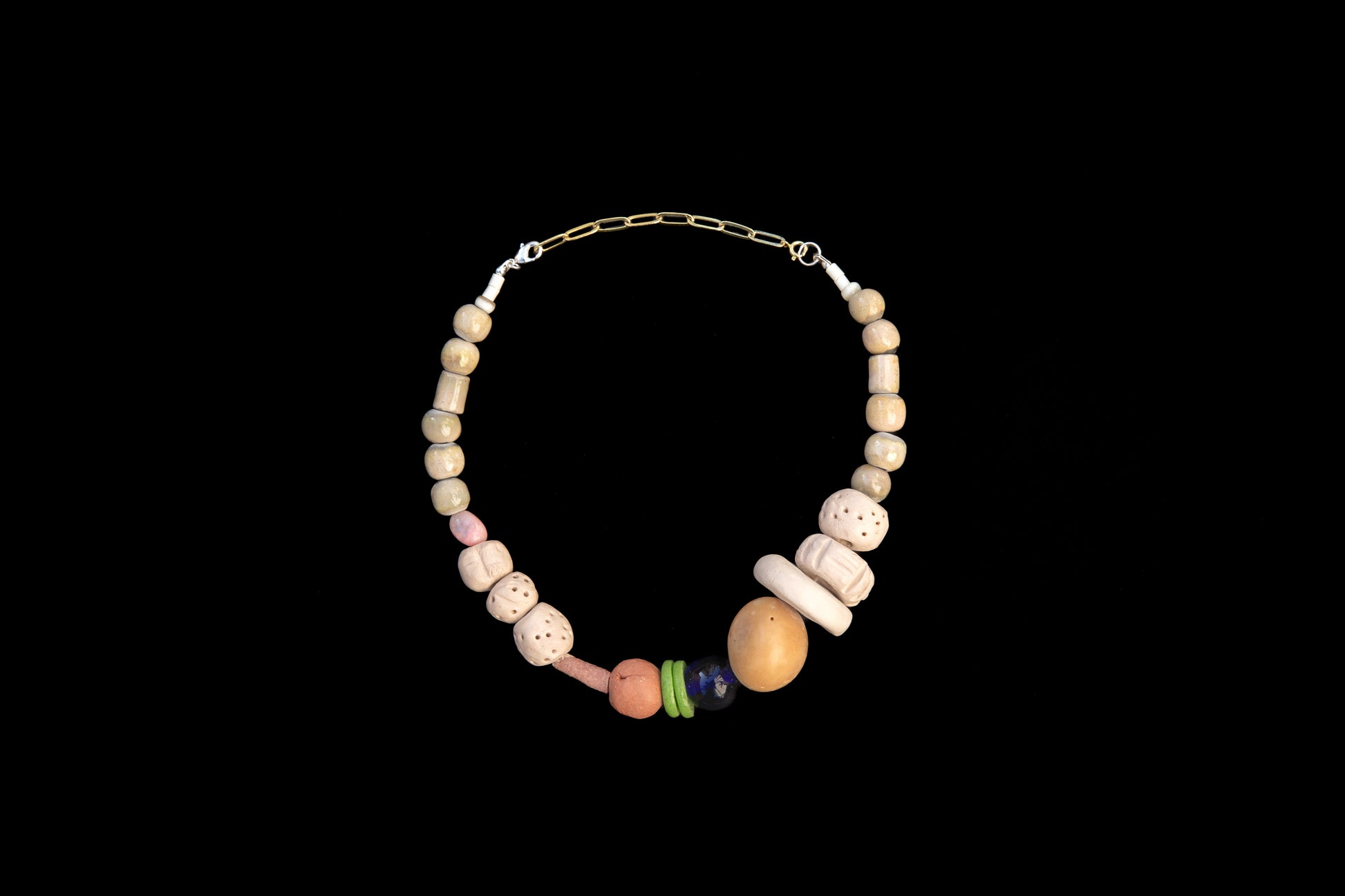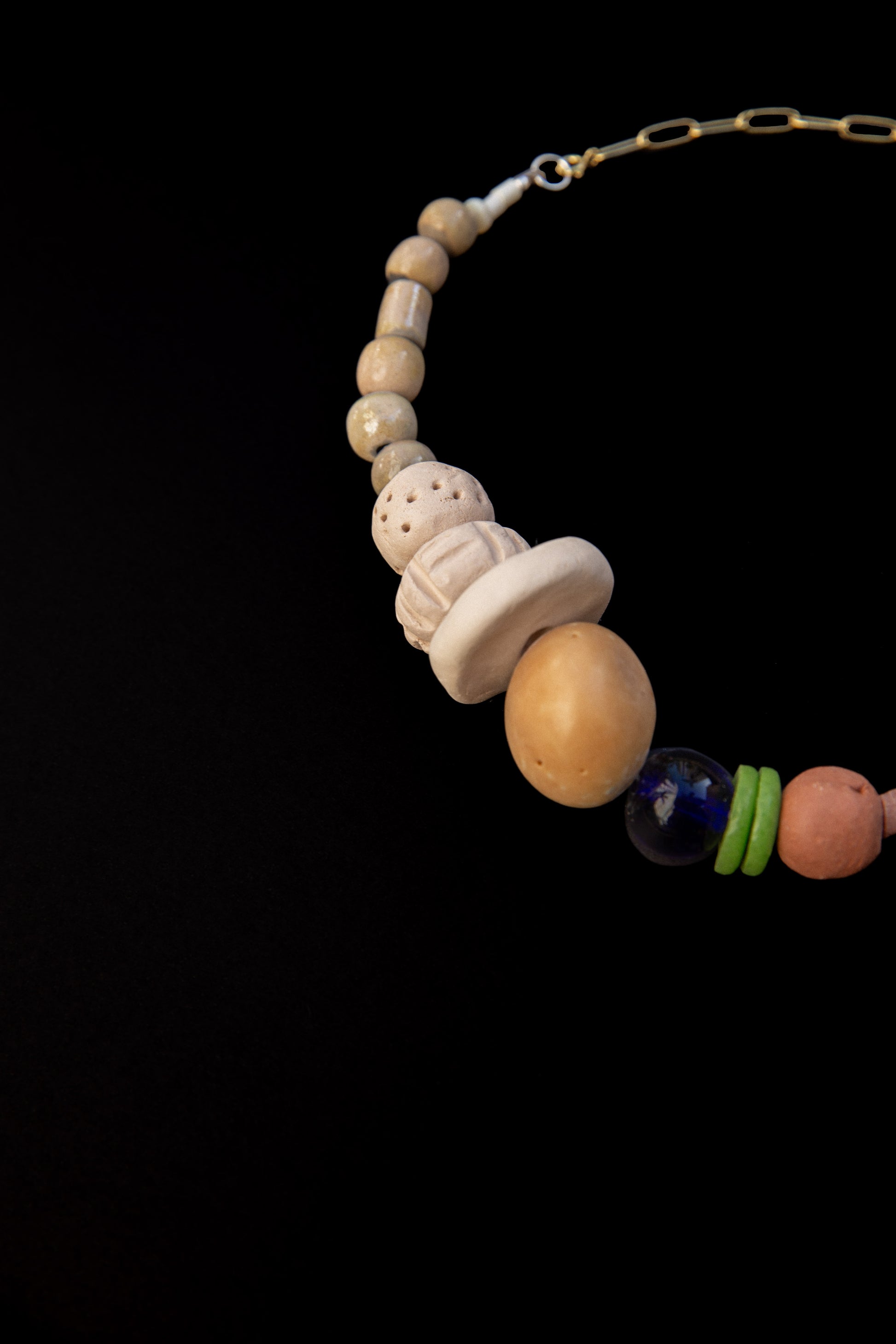 Gargantilha com mix de barro, cerâmica, coral africano, vidro e pedra natural. Fecho em prata de lei, acompanha extensor dourado com banho duplo de ouro 18k. Extensão total da peça: 45cm.